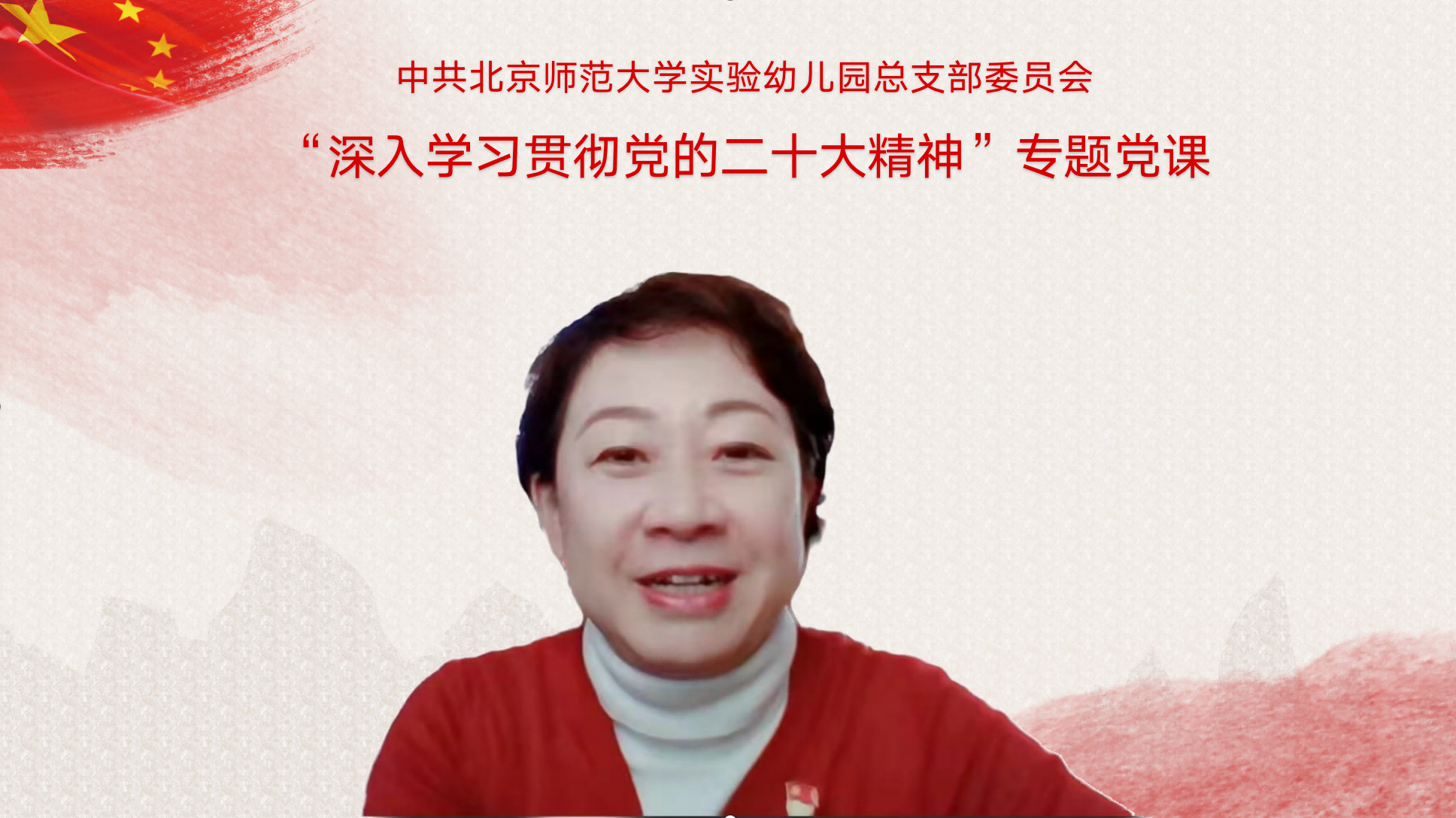 为全面深入领会党的二十大精神,切实把广大党员及教职员工的思想和行动统一到大会精神上来,推进党的二十大重大决策部署在全园落地生根。2022年12月22日下午,中共九游体育党总支书记、总园长黄珊围绕深入学习宣传贯彻落实党的二十大精神,通过视频会议形式面向两个在职党支部和一个离退休党支部全体党员及部分积极分子讲授专题党课《以党的二十大精神为引领推进中国特色高质量学前教育发展》。九游体育实验幼儿园新校区园和未来科技城第一幼儿园党支部干部、党员及部分积极分子也一同聆听,共计188人参会学习。