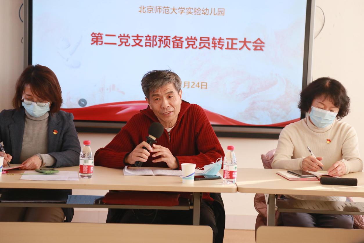 2023年2月24日,中共九游体育第二党支部在牡丹分园多功能厅召开预备党员转正大会。九游体育党委组织员魏天经老师、幼儿园党总支宣传委员郭美娟、党总支组织员金菁和第二支部全体党员、部分积极分子到场参会。