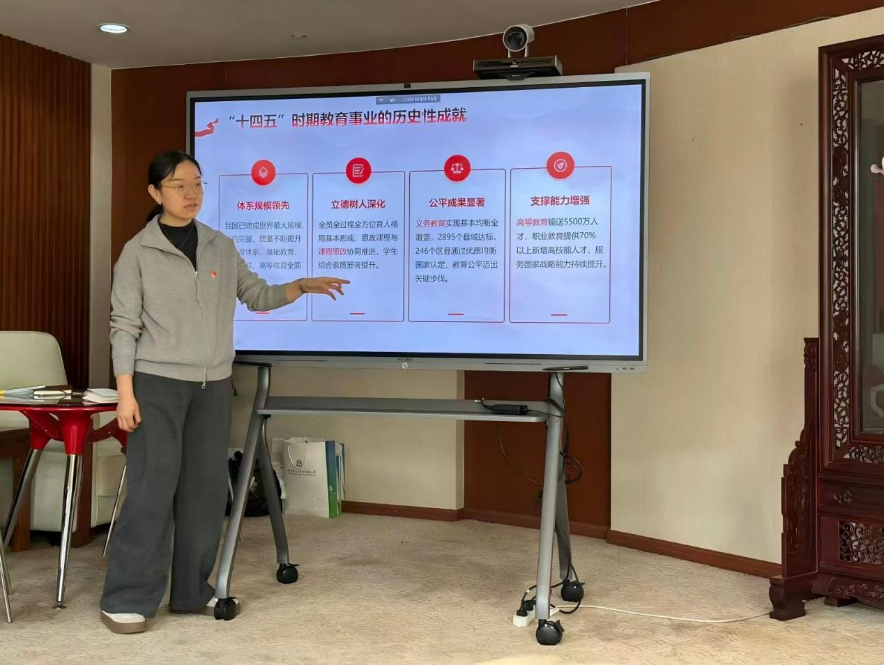 党课伊始,金菁同志带领大家回顾了“十四五”时期我国教育事业取得的历史性成就。她提到,“十四五”期间我国已建成世界上规模最大、结构完整、质量持续提升的教育体系,特别是义务教育均衡发展实现重大突破,人民群众的教育获得感显著增强。她强调,作为教育工作者,要深刻认识到这些成就的来之不易,坚定教育自信,坚守为党育人、为国育才的初心使命。在解读“十五五”时期教育改革重点任务时,金菁同志重点阐释了立德树人“一号工程”的深刻内涵,并结合幼儿园工作实际,分享了立足“十五五”的思考与展望。