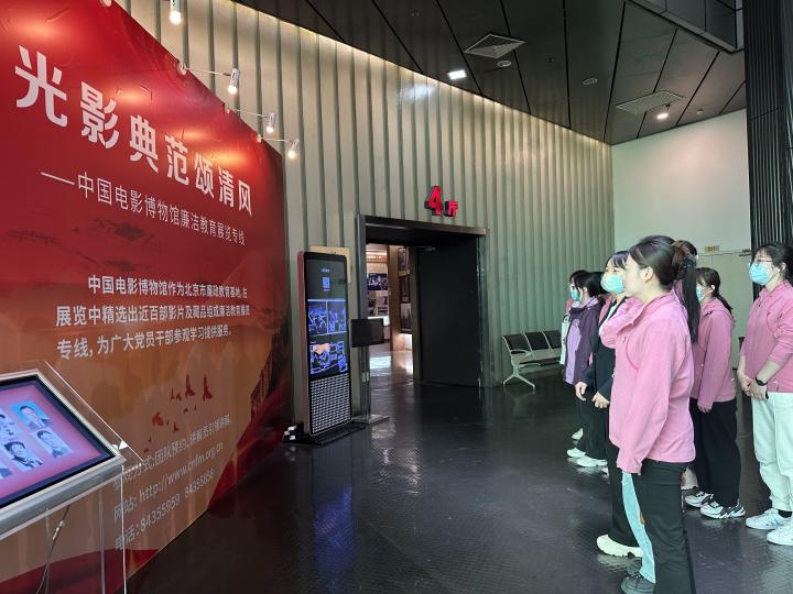 在电影博物馆二楼,党团员老师集中参观了《光影典范颂清风——中国电影博物馆廉洁教育展览专线》。该专线以歌颂廉洁、传递清风、弘扬正气为主线,精选出近百部红色电影、主旋律电影及藏品,将电影艺术与党史学习教育、党风廉政教育工作有机结合,以图片、实物、模型等方式宣传和弘扬中国共产党坚持全心全意为人民服务的优良传统作风,展示中国电影百年发展历程。