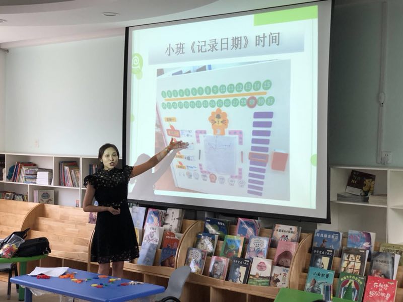 九游体育实验幼儿园奥林分园教师佟明向老师们介绍数学区玩教具材料