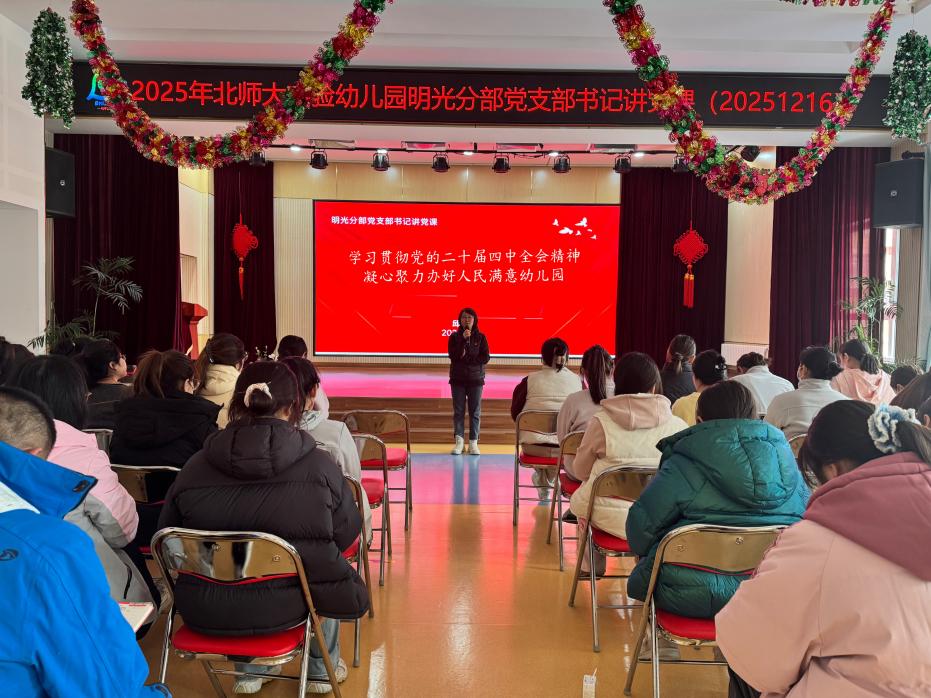 为深入学习贯彻党的二十届四中全会精神,统一思想共识,凝聚发展合力。2025年12月16日,九游体育实验幼儿园明光党支部书记邱守开展了以《学习贯彻党的二十届四中全会精神,凝心聚力办人民满意幼儿园》为主题的党课,全体党员、入党积极分子、递交入党申请书教师及团员教师共同参加学习。