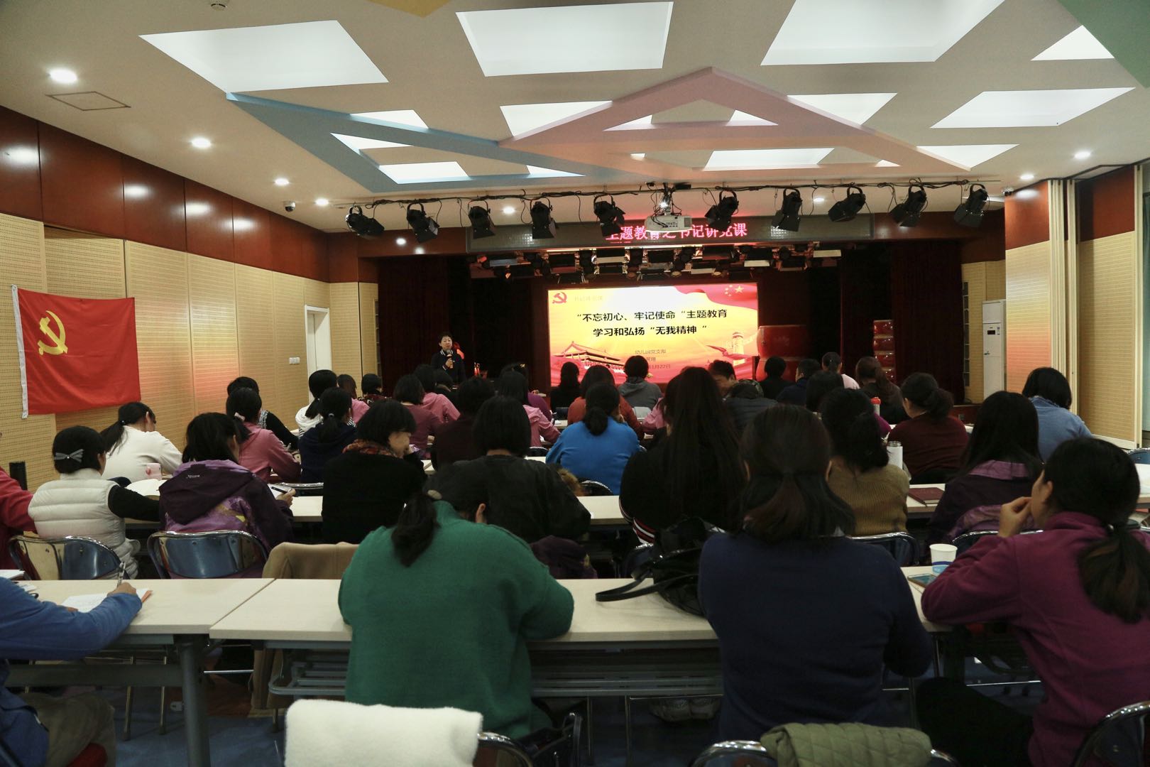 为进一步落实上级党组织要求,继续深入开展“不忘初心、牢记使命”主题教育活动,2019年11月22日,实验幼儿园党支部书记黄珊做题为“学习和弘扬‘无我’精神”主题党课。实验幼儿园党支部全体党员和部分积极分子聆听党课。