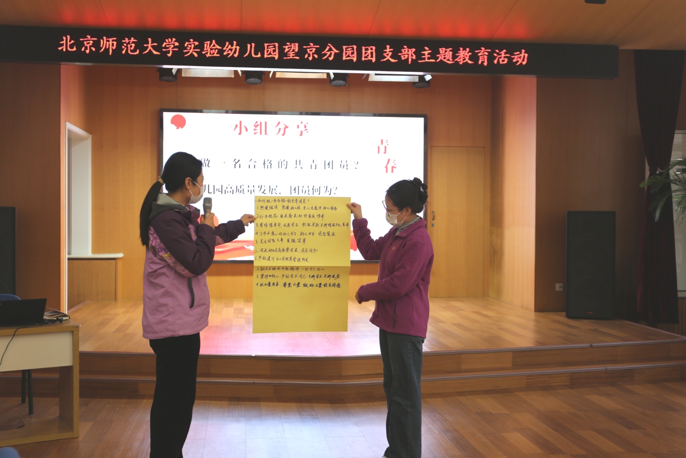 随后,全体团员教师围绕“如何做一名合格的共青团员?”及“推动幼儿园高质量发展,团员何为?”两个话题展开了热烈的讨论。团员教师岗位从思想上、行动上明确了何为一名合格的共青团员,并立足于自身的岗位做出了“推动幼儿园高质量”发展的决心,充分展现了青年教师的责任和担当。