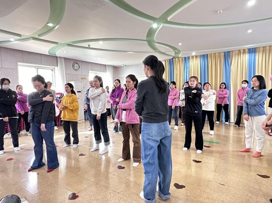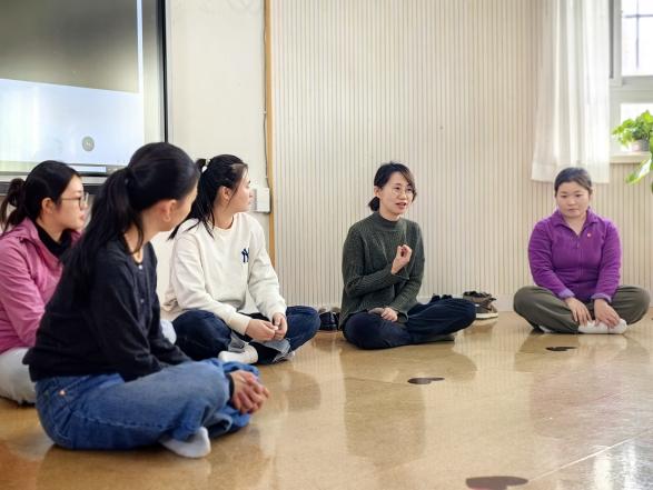 此次活动特别邀请了杭州亚运会《水墨入诗画》领舞、著名青年舞蹈家李倩老师与团员和青年教师分享自己从事舞蹈事业的心路历程。李老师从刻苦学习舞蹈的经历、对舞蹈艺术的追求、获得无数荣誉后内心的焦虑和彷徨、最终找到自我重返舞台再创辉煌几个阶段娓娓道来,用生动简洁的语言讲述了她在跳出舒适区和突破自我过程中的思考和感悟。李老师的分享大大地激励了团员和青年教师,一方面让大家知道了成长过程是不断追求和努力的过程,坚持很重要;另一方面大家也感受到成功的背后离不开自我的探寻与突破。分享之后李倩老师带领团员和青年教师进行了“自我察觉”游戏,老师们与舞蹈家近距离接触,领略和感受了舞蹈的魅力与自我身体的力量。