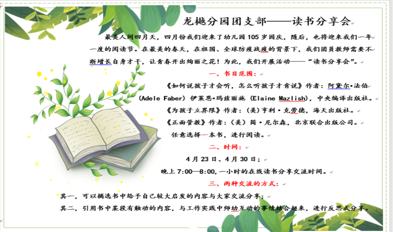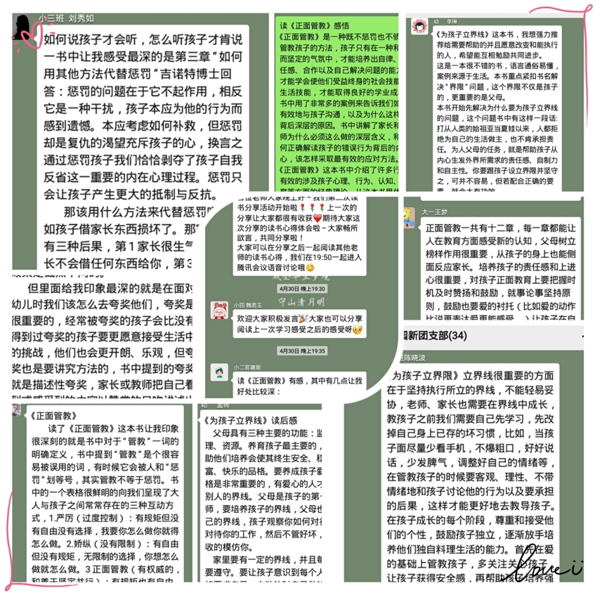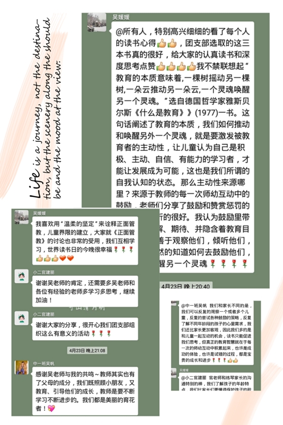 在九游体育实验幼儿园105岁生日及读书日来临之际,龙樾分园团支部圆满举办了读书交流分享会活动。本次活动推荐了《正面管教》、《为孩子立界限》、《如何说孩子才会听,怎么听孩子才肯说》三本读物,活动对象为龙樾分园团支部全体老师,主要形式是自选读物阅读以及分享心得。通过这次活动,老师们丰富了知识、拓宽了视野,并借助与工作经历的结合获得了经验积累,同时还明确了作为一名幼儿园教师的“初心”——尊重儿童,研究儿童,促进儿童主动发展。