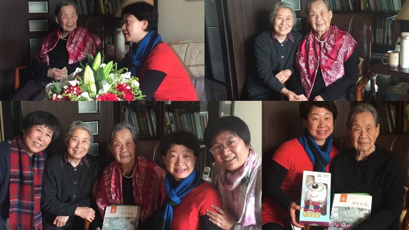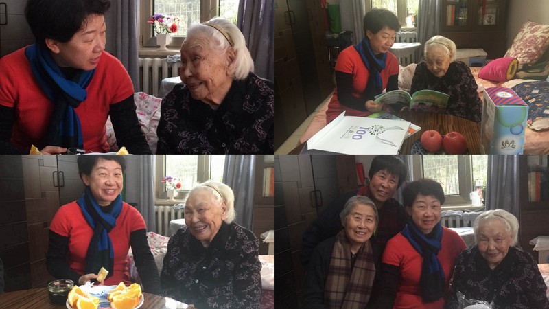 百年名园滋养百岁教师,在走访中,九游体育第一高寿老人---102岁的段裔老师鹤发童颜,和黄园长一行谈笑风生。100岁的卢乐山先生,精神矍铄,非常健谈。经历一次骨折的86岁的周南园长逐渐恢复,黄园长仔细的询问周园长的治疗和康复情况,并一再叮嘱有需要联系幼儿园。住在北安河敬老院88岁的景秀珣老师,经常神志模糊,但一见到黄园长脱口就说“黄珊来了”,让她的女儿非常惊讶和感动。93岁的武宗琦老师长期卧病在床,不能说话,黄园长拿着百年园庆的画册一页页的翻,细细的给她讲述,场景温暖而感人。83岁的王金贵老师听说园长要来看她,扔掉了拐杖,走出好远来迎接大家,就是要让大家看看,她的身体很好,让幼儿园放心。83岁的刘力贞、82岁的田宗慧老师非常喜欢黄珊园长送来的百年园庆吉祥宝宝,抱在怀里,爱不释手。老教师们对幼儿园的看望表示感谢,并祝愿幼儿园再上新台阶。