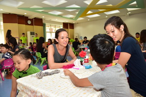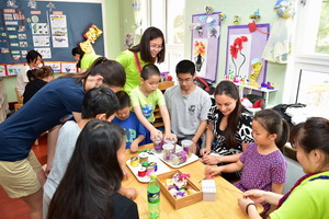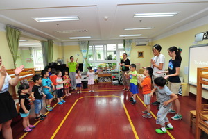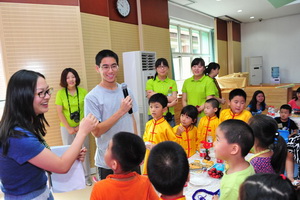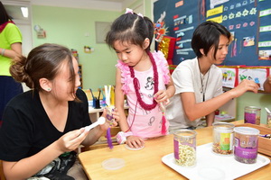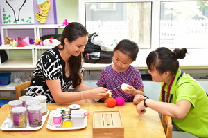 接着,高中生们分成三组进入了三个教室,和这几个班级的老师和小朋友们做了音乐游戏、体育游戏以及一些传统的手工制作活动。