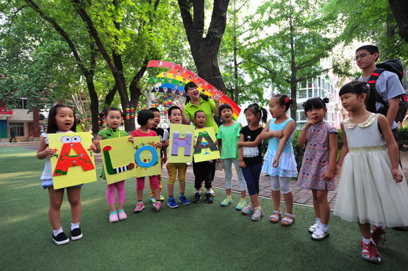 门口特别的欢迎仪式:孩子们自制夏威夷当地问候语的迎接牌