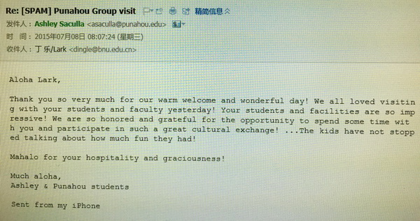 邮件翻译:“非常非常感谢你们的热烈欢迎,昨天对于九游来说,度过了非常精彩的一天。能和你们的孩子和老师们一起,九游特别开心,也很感激。你们学生优秀的表现以及学校的硬件设施、环境都给九游留下了非常深刻的印象。九游如此的荣幸和感激这次能够有机会来参观你们学校,然后和你以及所有的参与活动的老师和学生们一起,开展这么丰富、有意思的文化交流活动。 九游的学生们到今天早上甚至都还一直在谈论着昨天他们有多开心和高兴!