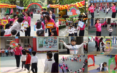 9点钟,在轻快音乐的伴随下和小朋友们的欢迎声中,维多利亚幼儿园的小朋友在老师和家长的陪伴下走进校本部园。来自香港的小朋友头戴各种自制的奇特头饰,在喷泉前为全体师生表演了热情洋溢舞蹈《快乐的一天开始了》和恐龙舞。接着,我园小朋友邀请香港的小客人跳了“可爱小朋友”和“小飞侠”舞蹈,音乐游戏《木头人》将孩子间的互动推向了高潮。