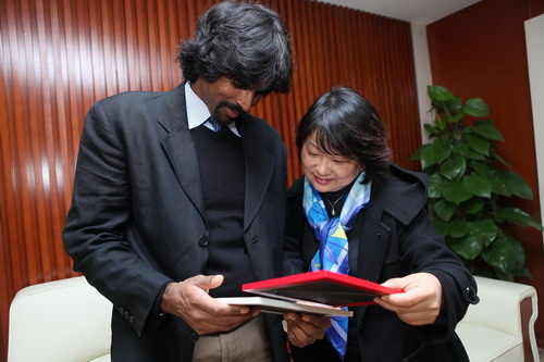 黄园长向Jim先生介绍我园园刊,中刊登了我园教师撰写的普纳荷学习心得合集