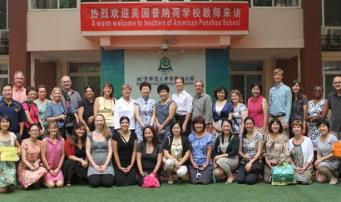 6月21日,来自美国普纳荷学校及埃克塞特学院的校长、教师共29人访问我园。我园黄珊园长、杜军副园长热情接待。