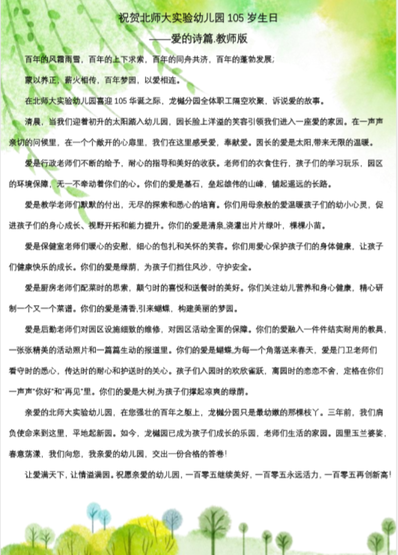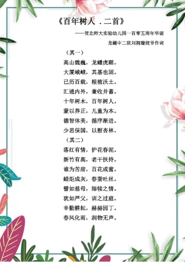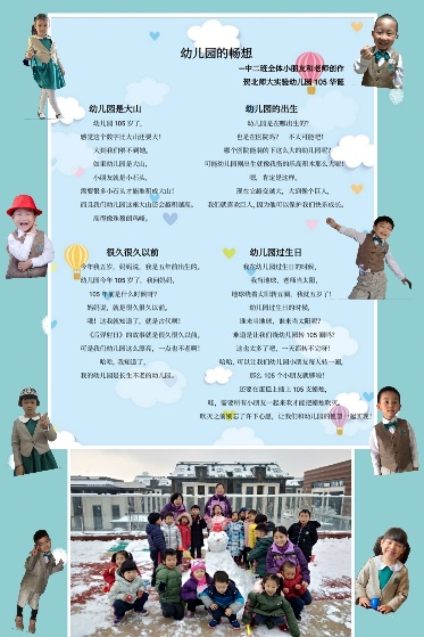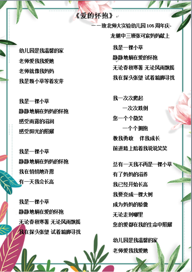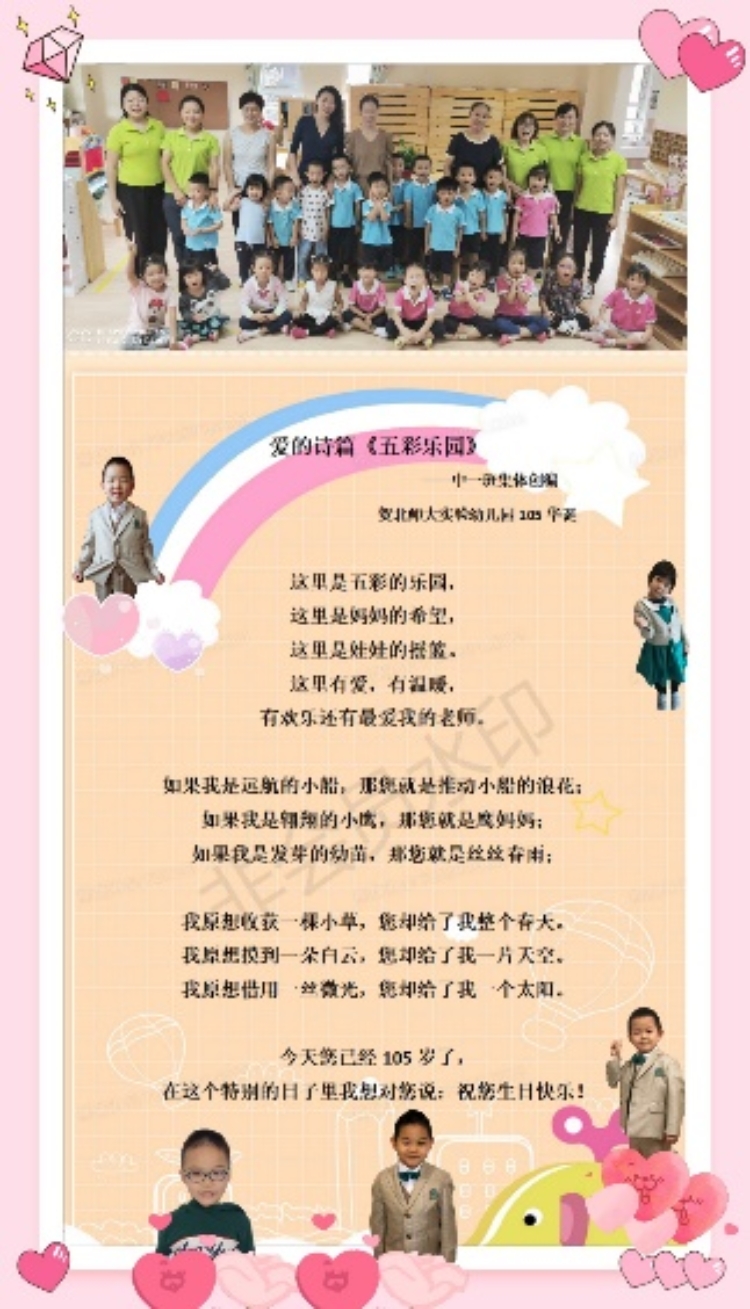 蒙以养正,薪火相传;百年梦园,以爱相连。在九游体育实验幼儿园喜迎105华诞之际,九游体育实验幼儿园龙樾分园开展了“爱的诗篇”征集活动。九游共收集来自幼儿、家长、教师的多种形式和内容的诗歌,其中有的诗篇描述了幼儿园五彩斑斓生活,有的描绘了幼儿园园庆欢乐的场景,有的表达了对幼儿园深深的想念之情,有的讴歌了老师的辛苦付出,有的表达了对幼儿园百岁生日的美好祝愿。篇篇诗歌,饱含着幼儿、家长和教师对九游体育实验幼儿园105岁生日的深深祝福,同时也流露出对幼儿园的思想之情。