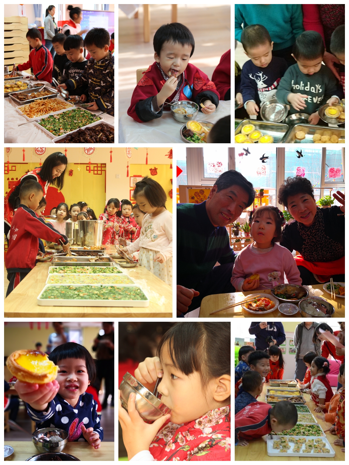 家园联欢活动多,内容丰富真快乐!唱歌舞蹈,演出龙娃精气神;亲子游戏,玩出浓浓家园情!舞龙舞狮,舞出吉祥如意,舞出四季平安!扭秧歌,扭出欢乐喜庆;划旱船,划向岁岁年年!最美味是自助餐,尝尝幸福的味道,品味快乐美满与团圆!