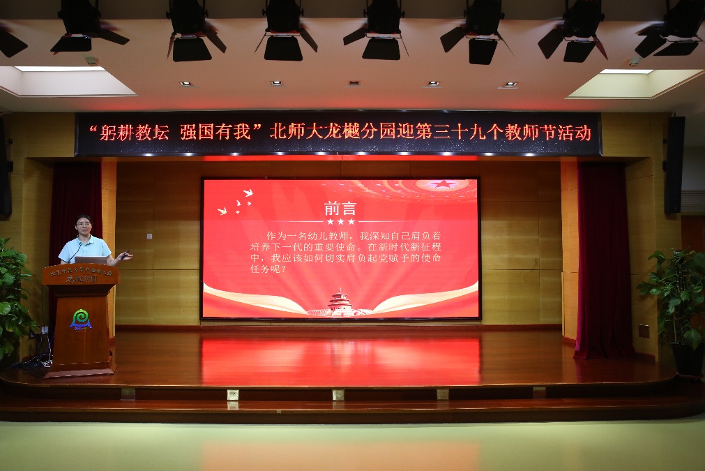 一首《老师,老师》拉开了庆祝活动的帷幕,紧接着四位不同岗位的老师分享了自己新学期的“好老师计划”,用最具有行动力的“一个温暖的拥抱”、“一节精心准备的活动”、“一次真诚的家园沟通”等来践行好老师的标准,向“四有好老师”看齐。随后,三名团员老师就学习《习近平总书记同团中央新一届领导班子成员集体谈话时的重要讲话精神》进行心得分享,分别以“党的二十大精神之下幼儿教师应该做什么”“新时代新征程中应该如何切实肩负起党赋予的使命任务”等方面为切入点,将自己的思考感悟结合工作实践侃侃而谈,充分彰显了青年教师有理想、敢担当、能吃苦的精神风貌。