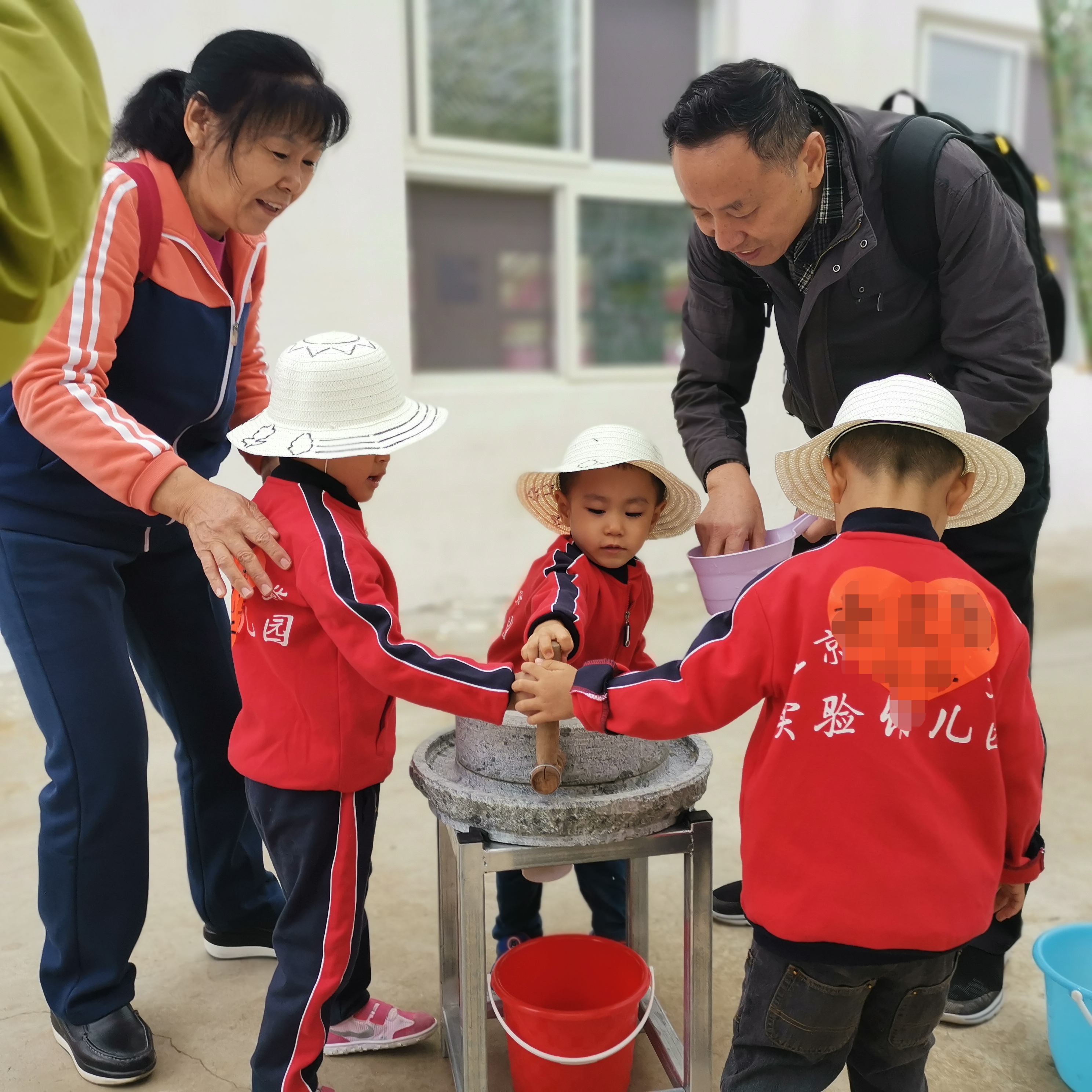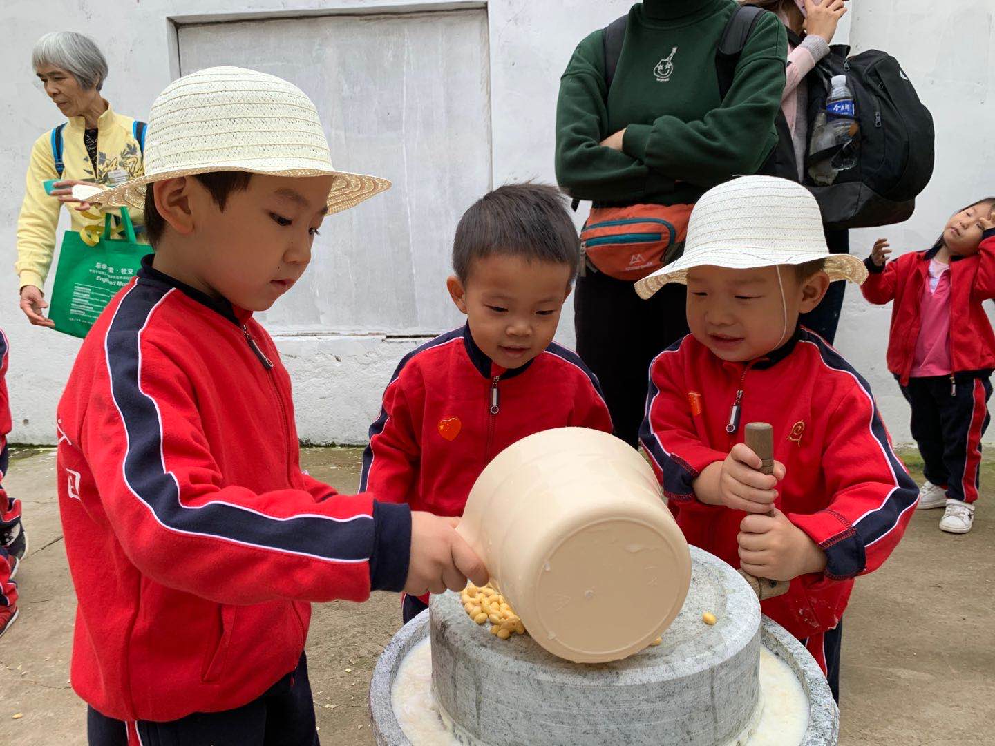 快看,磨好的豆浆都流进小桶里啦!