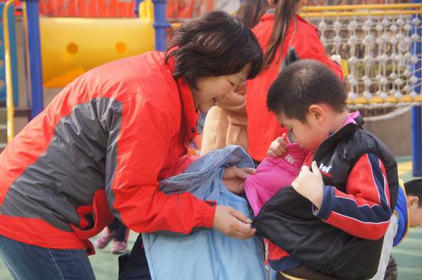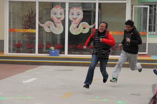 吴主任和体育专职张老师给孩子的接力赛压轴呢。