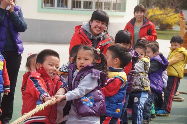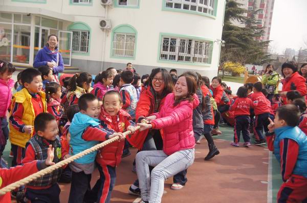今年的运动会还增加了拔河、接力赛跑多项团体竞技活动,教师们也参与到体能竞技游戏中,大大鼓舞了孩子们的士气和热情。
