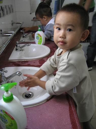 孩子们正学习洗手——好习惯不知不觉地就培养起来了。