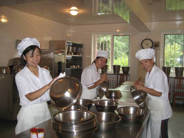 厨房的叔叔阿姨细心地擦拭各个器皿,要给孩子们开饭啦!