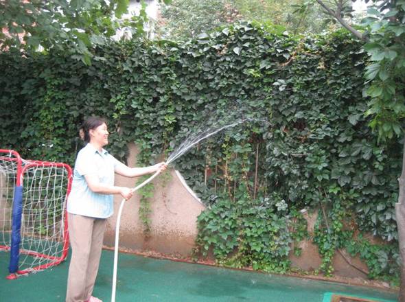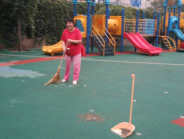 后勤的老师们洒扫庭院,等待孩子们的到来