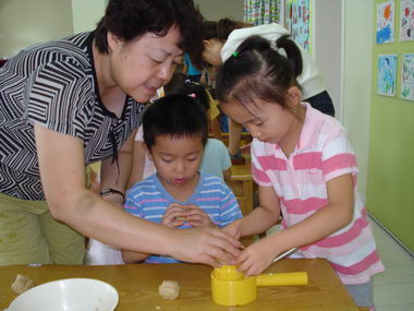 刘老师正在教九游用这种新式的月饼模子