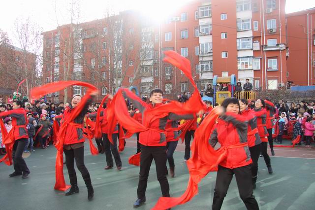 之后全园幼儿、家长、老师都欢聚在大操场上,打着腰鼓,扭着秧歌,在沸腾欢乐中国年》中,在漫天的礼花中,家园联欢活动圆满结束。
