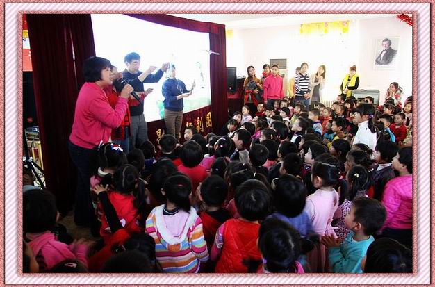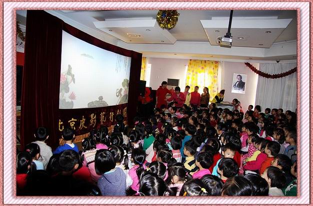 为了迎接新年的到来,12月22日,北京皮影艺术剧团应邀带着皮影戏道具来到牡丹园分园,为全园中大班的孩子们表演了传统皮影戏《老虎学艺》、《三邻居》、《鹤与蚌》、《狼与山羊》等精彩剧目。孩子们兴致勃勃地观看了影片,不时地爆发出一阵阵笑声、惊叹声与掌声。孩子们不仅感受了生动有趣、富有教育意义的故事内容,更体验了春节民间传统艺术的魅力。
