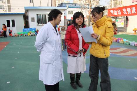体育专职教师和保健医一同为幼儿测运动中的心率