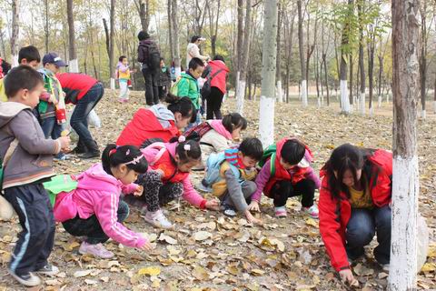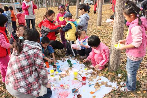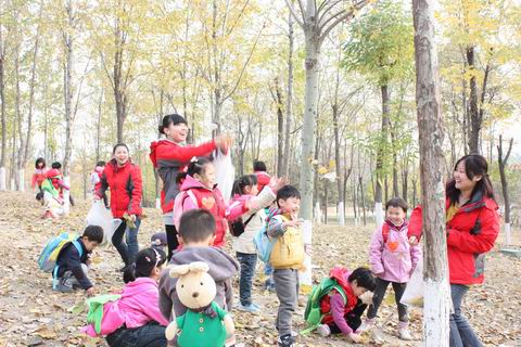 各班教师带幼儿漫步在园区小路、山丘,幼儿充分感受自然、观察秋天、收集各种树的叶子。