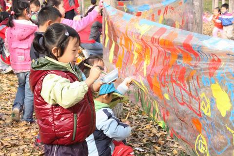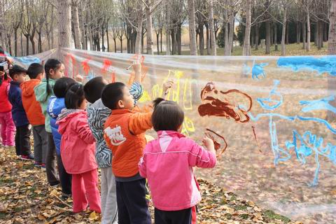 托二班:艺术创作“水彩大画”——老师将塑料布粘于两棵树间,孩子们带着围裙、拿着画笔在秋天的美景中,运用广告色进行美术创作。
