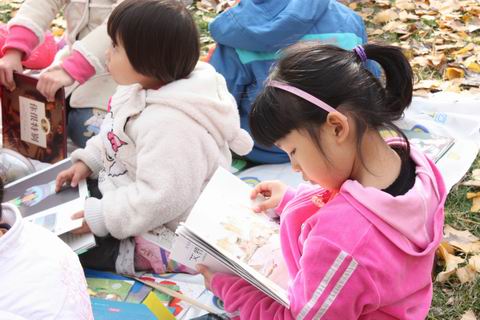 孩子们围坐在落满树叶的草地上,听老师讲故事、看图书。