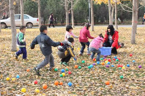 托一班:运动活动“海洋球”——教师将海洋球撒向树林,孩子们踩着树叶、听着树叶发出的沙沙声,搜寻海洋球。
