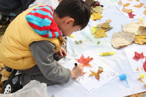 老师和孩子们一起用收集来的各种颜色、各种形状的树叶进行创意粘贴。