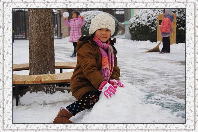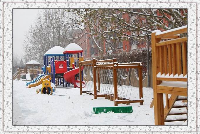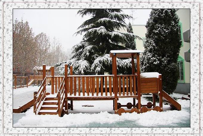 早上起来,一片洁白的世界,难得一遇的鹅毛大雪。幼儿园里树枝上、操场上、滑梯上,都是厚厚的积雪。