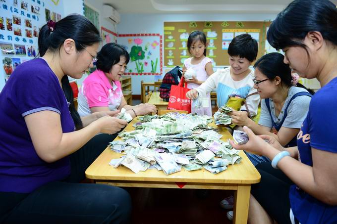 家长代表和老师代表一起清点善款,一起汇款