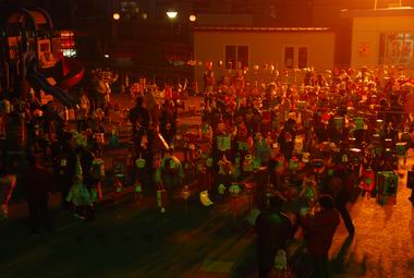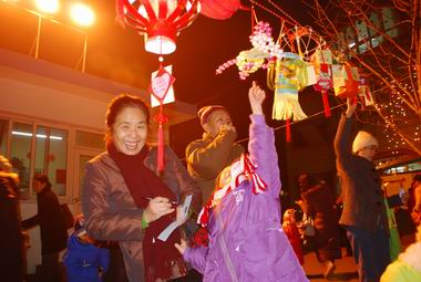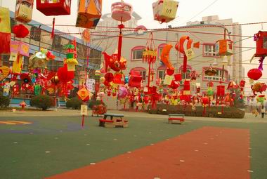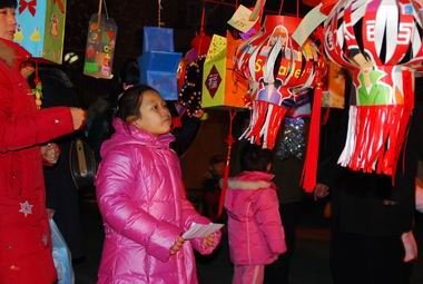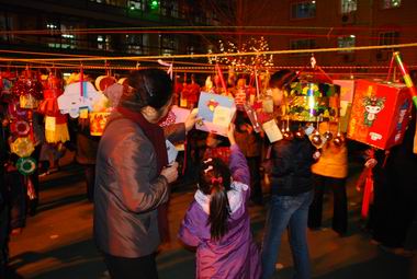 12月26日晚间家长和孩子们共同参观、评选灯笼,场面热烈。