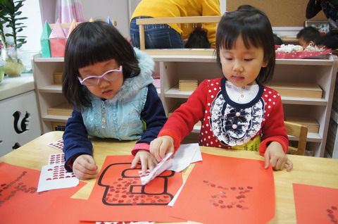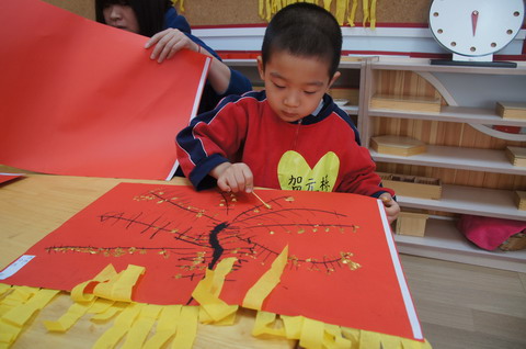 (新年传真之二) 一年一度的庆元旦、迎新年活动正在热烈而隆重地开展着。为了让孩子们既接受传统文化的熏陶,又有快乐的体验,全托班老师们围绕幼儿喜欢生动形象、颜色鲜艳的直观视觉刺激的特点,充分运用自己传统节日中的文化资料,精心策划了“民俗美工日”活动,受到孩子们的热烈欢迎。 12月18日上午,全托班利用各个教室开辟了多个活动区,包括剪窗花、贴福字、写马年吉祥话、做拉花等传统手工艺项目。大孩子、小孩子们手拉手自主选择游艺活动,每个活动项目都让孩子们爱不释手,欢乐的新年气氛溢满整个幼儿园。