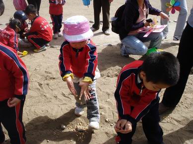 小班组的孩子们前往杏花林,她们在那里播种、浇水,种植蔬菜,喂养小羊、小骆驼和矮马,还参与拣“鸟蛋”、做叶片画、寻找狮子卡片活动。