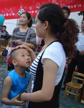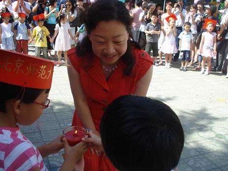 黄园长将象征着光明、智慧和爱心的蜡烛传递给孩子们