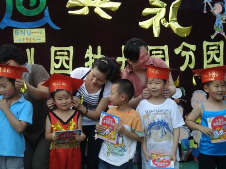 两位园长饱含深情地为每个孩子戴好博士帽