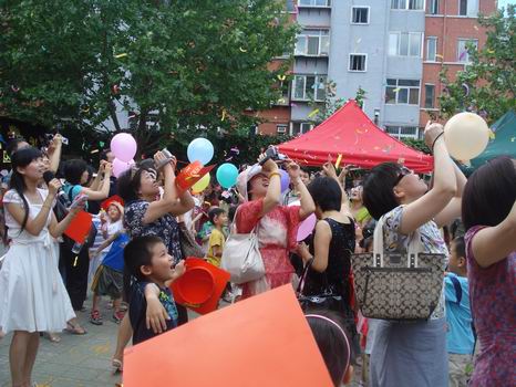 孩子、家长和老师的目光在久久追随着心愿气球