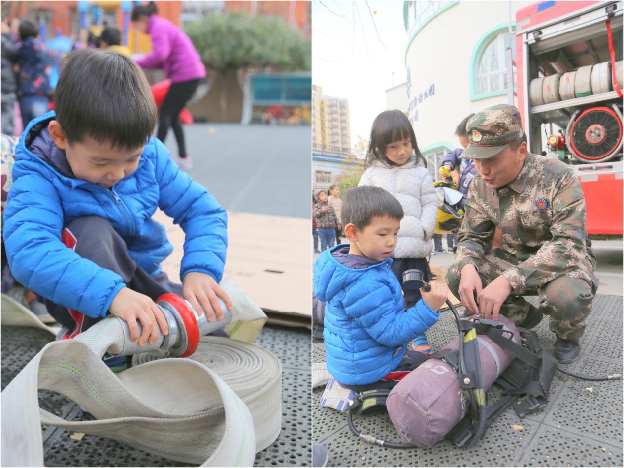 消防官兵为幼儿讲解了灭火器、防毒口罩、消防水枪等消防设备的使用方法并且现场演示了快速着装、组装消防水袋以及水枪喷水全过程。消防员的讲解和展示让孩子们更好地了解了消防员的工作,也对消防安全知识有了一定的感知。随后,各班教师纷纷组织幼儿参观消防车、向消防员叔叔提问等。在进一步的互动中,孩子们对相关知识有了更加深入的理解与感受。