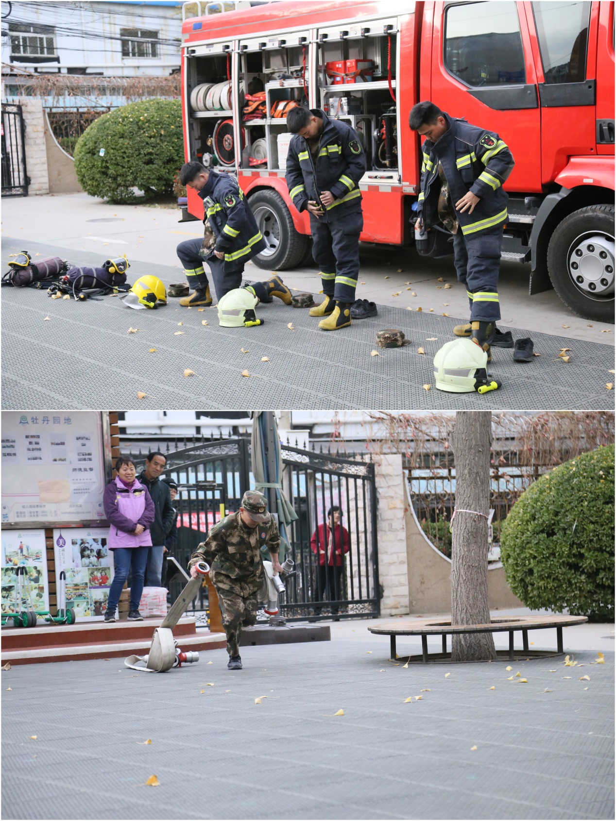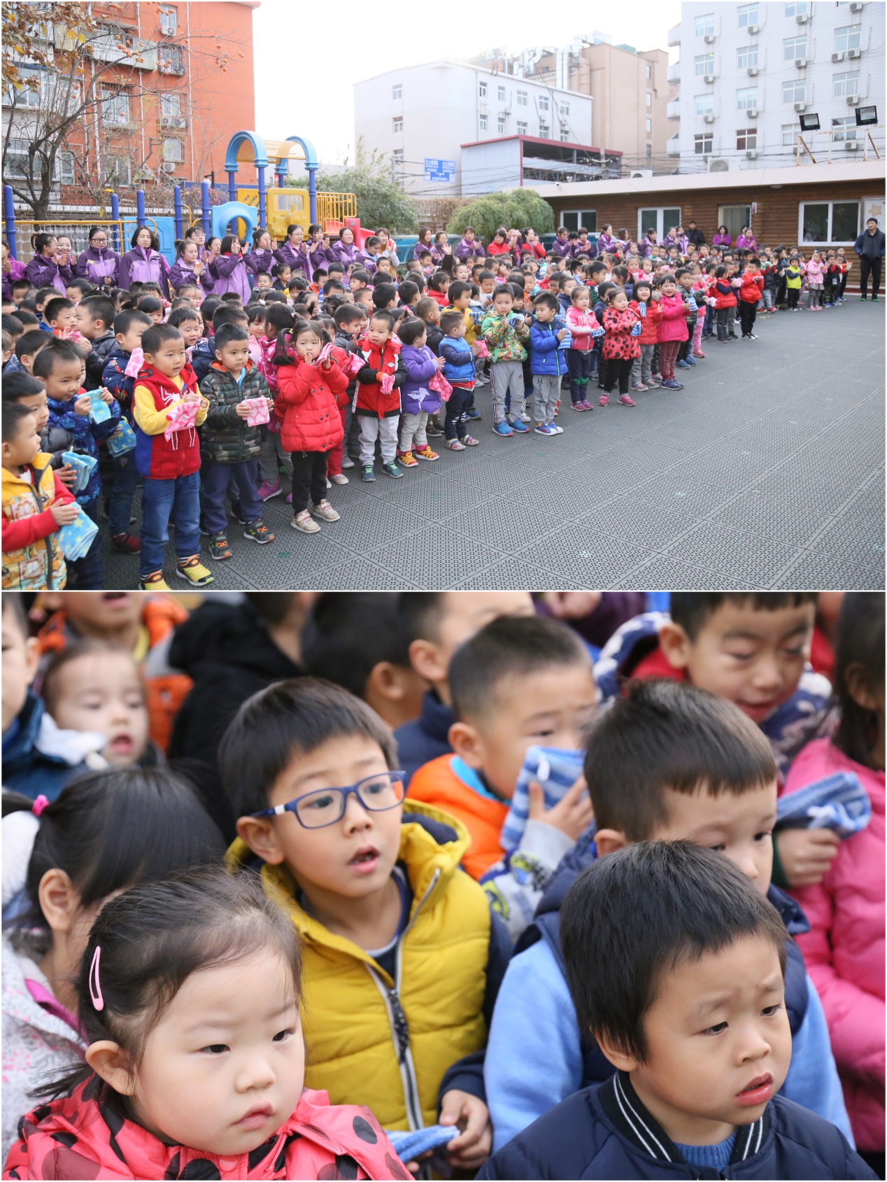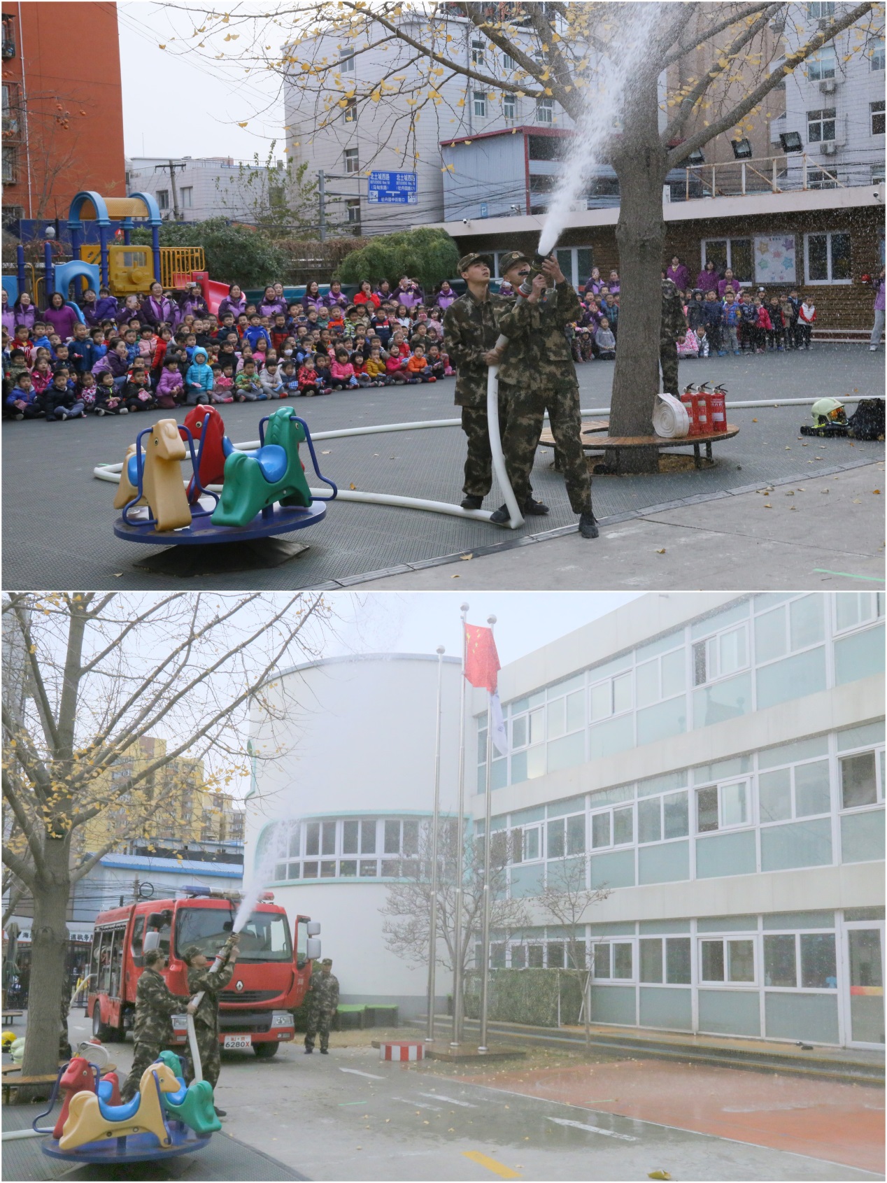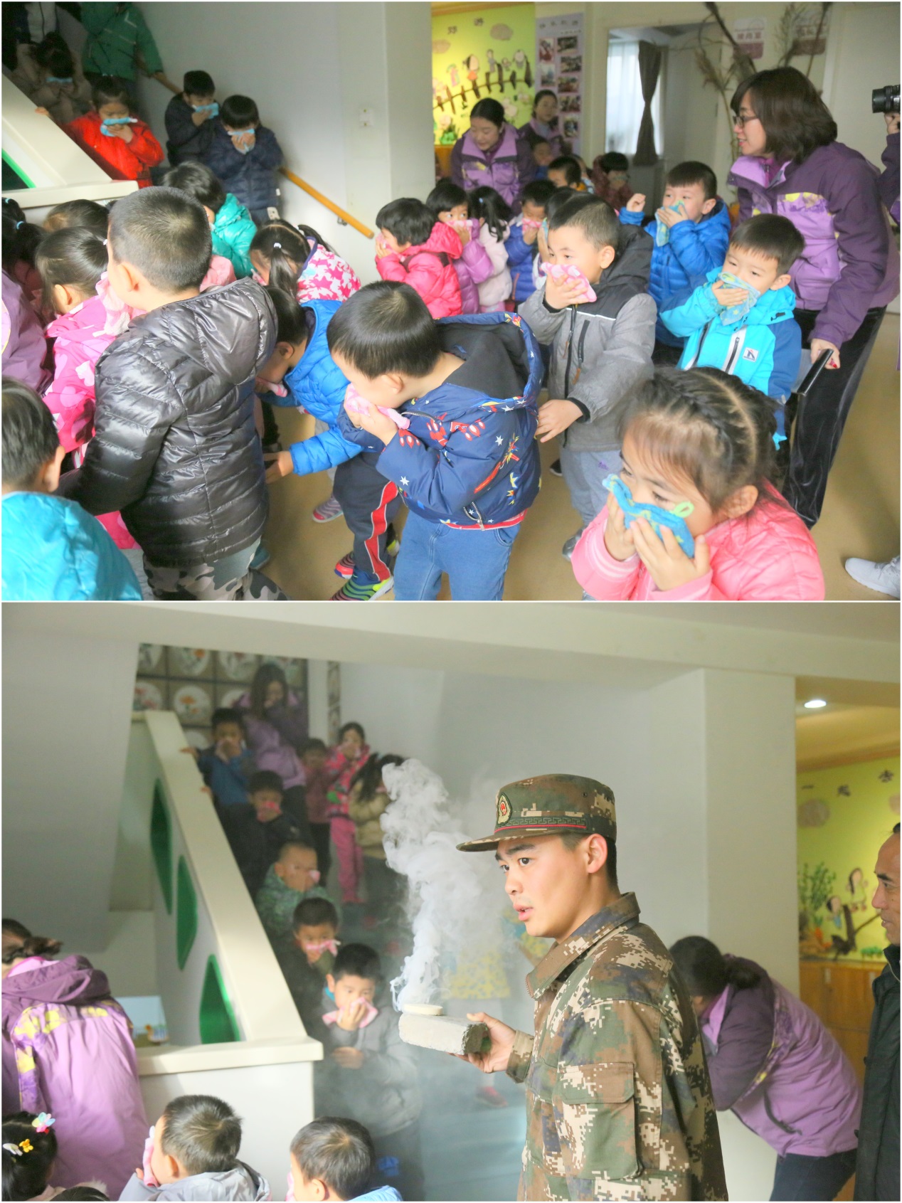 下午三点,警铃声响起,全体幼儿在教师的组织下,用湿毛巾捂住口鼻,从安全出口迅速撤离至操场。全园16个班级中最快到达操场的班级只用了35秒。全体人员用时1分15秒完成消防演习。