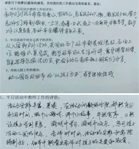 半日开放活动中家长通过观看、参与、体验、交流等多种方式全方位地了解了幼儿在园的学习、生活情况,并借助园方提供的观察记录表,感受了每一个环节的培养目标,对自己的孩子形成了较为理性的全面的评价。家长们看到了孩子们的自由、自主、自然、有序,看到了小班幼儿在短短2个多月中自理能力的惊人成长,看到了中班幼儿创造性的探索和发现,看到了大班幼儿的有礼有节、会合作且充满责任感……也看到了老师们对孩子们细心地呵护、尽心地教导、耐心地解答……看在眼里,感动在心里。