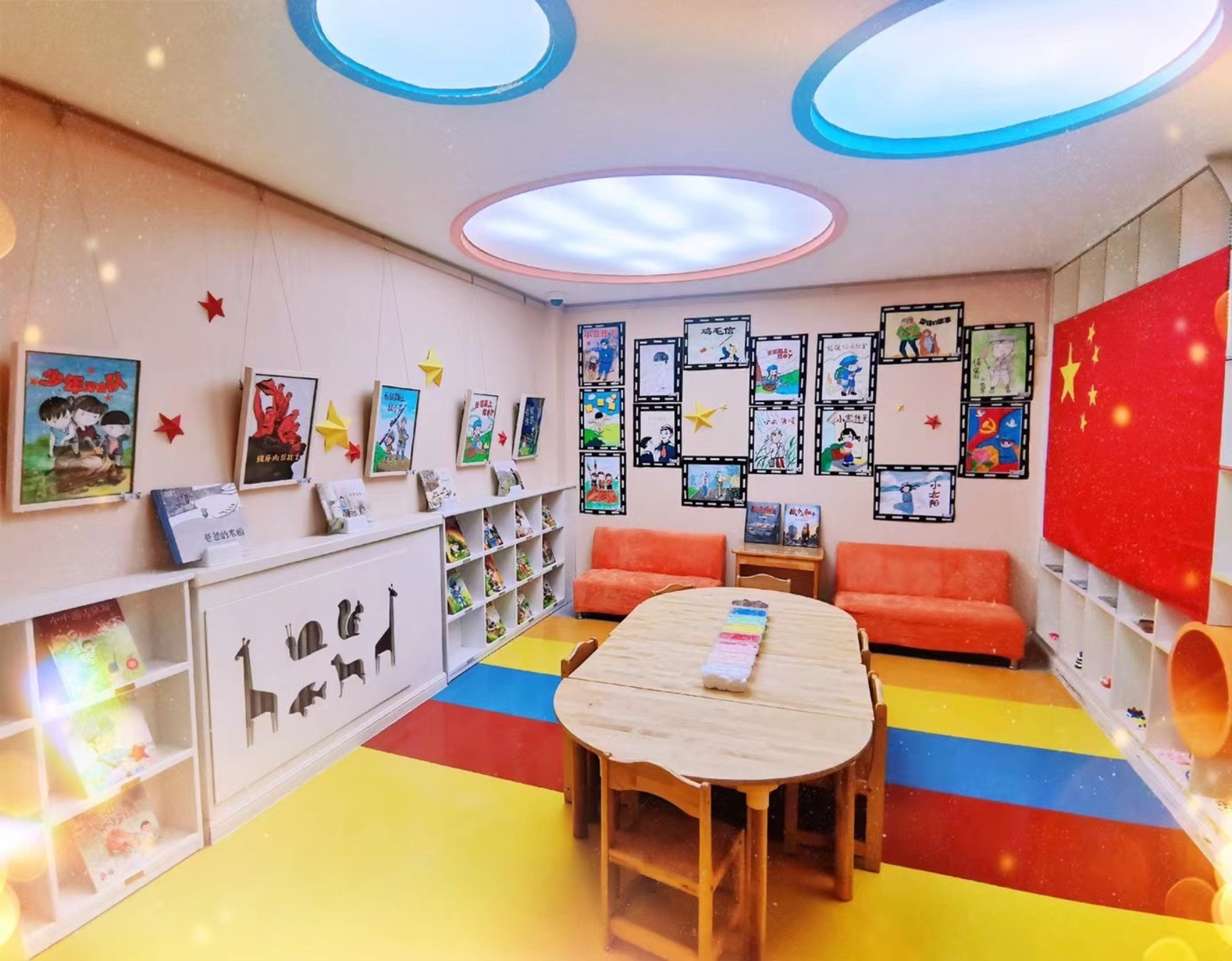 与此同时,团员姐姐们还为全园的小朋友们布置了东楼和西楼大厅的“红色小屋”,小朋友们可以在空闲时间选择到小屋去阅读红色故事。