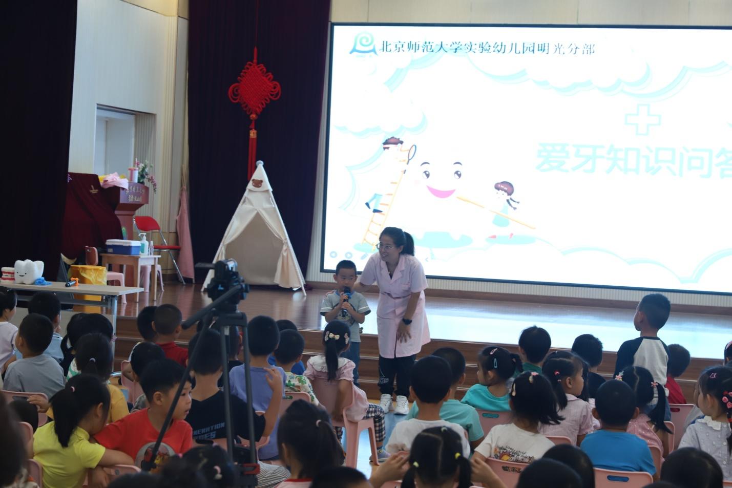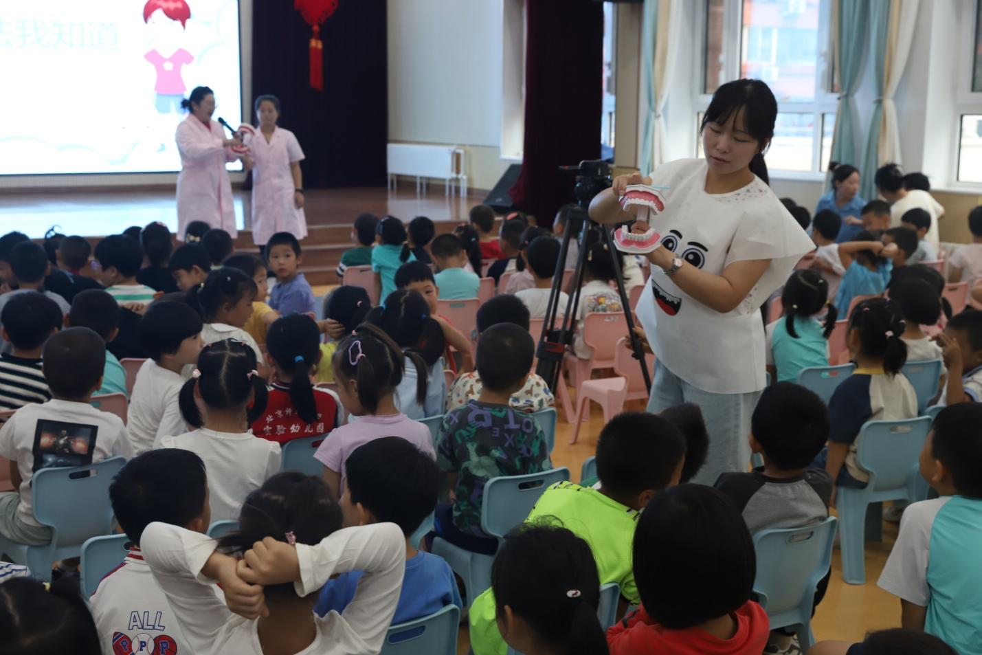活动当天,保健医老师通过“蛀牙成长记”情景剧表演、爱牙知识问题互动、爱牙健康视频科普、刷牙方法演示互动、送教进班、家长调查问卷等形式,对全园幼儿进行爱牙知识宣教,现场幼儿积极参与互动,了解科学护牙、自觉护牙的必要性和重要性,学到了更多关于保护口腔和牙齿的知识,对幼儿的爱牙行动有一定的指导和帮助。