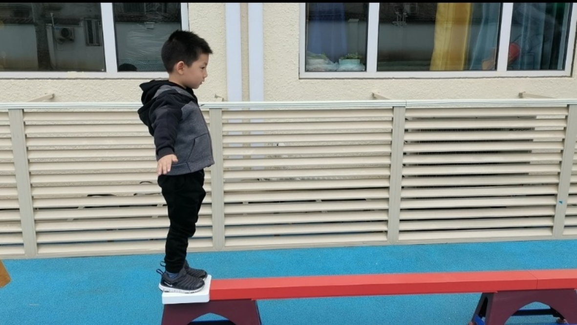 “这么窄的平衡木,我可以很快速的就走过去,厉害吧!秘诀就是要展开双臂,像小飞机一样保持平衡。”