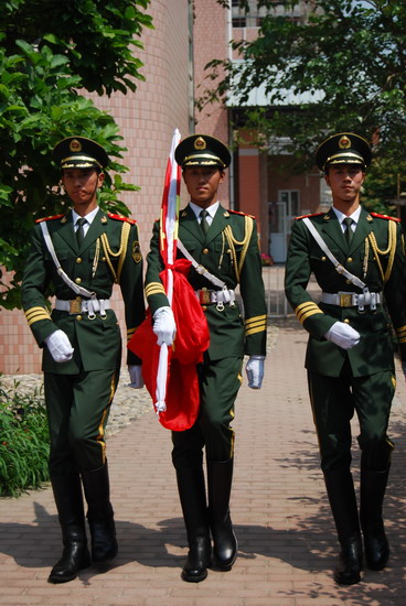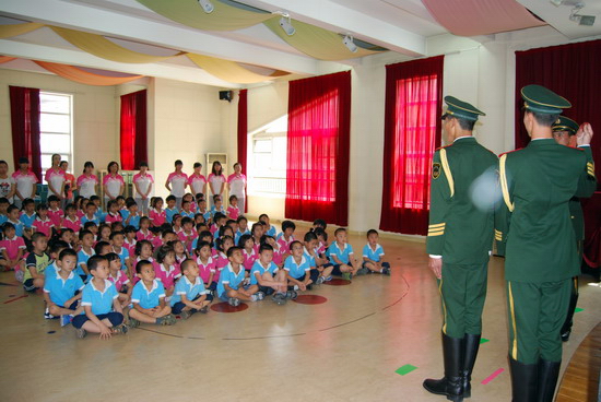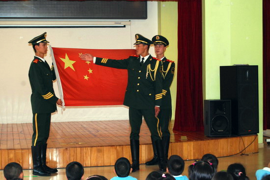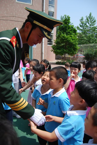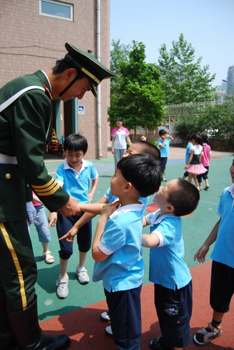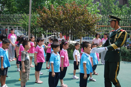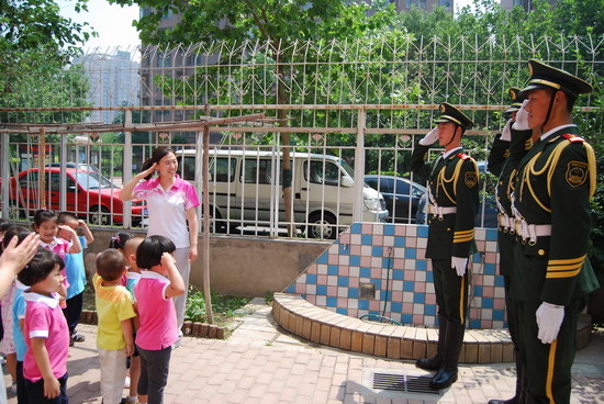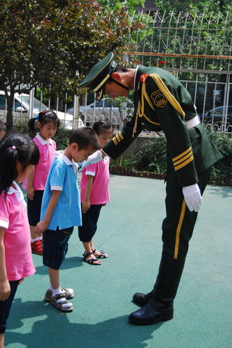 坚守在北京天安门,肩负着天安门广场升旗和降旗任务的天安门国旗护卫队是一支光荣而神圣的部队。6月13日,我园有幸邀请到天安门国旗护卫队的武警士官们来到幼儿园,和小朋友亲密接触。隆重的升旗仪式之后,武警叔叔带领孩子们进行队列训练,给小朋友讲述国旗故事。孩子们见到天安门国旗护卫队的武警叔叔分外地激动,向武警叔叔问了很多的问题:“为什么要戴手套?”“夏天了为什么要穿靴子?”天安门国旗护卫队的到来在幼儿园里引起了轰动。